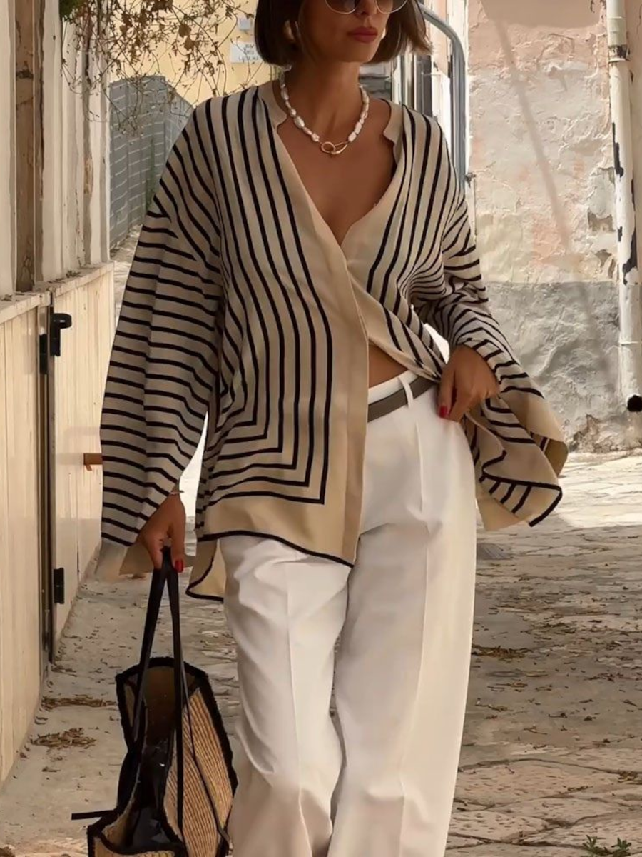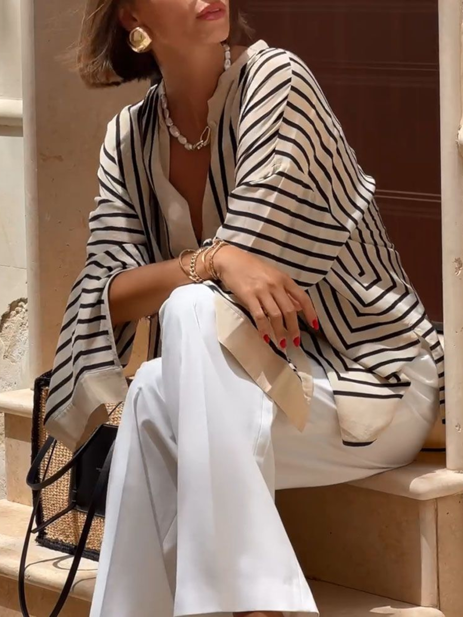 Seu tecido fluido e o caimento solto criam um visual confortável e elegante, enquanto as listras geométricas acrescentam personalidade na medida certa.
